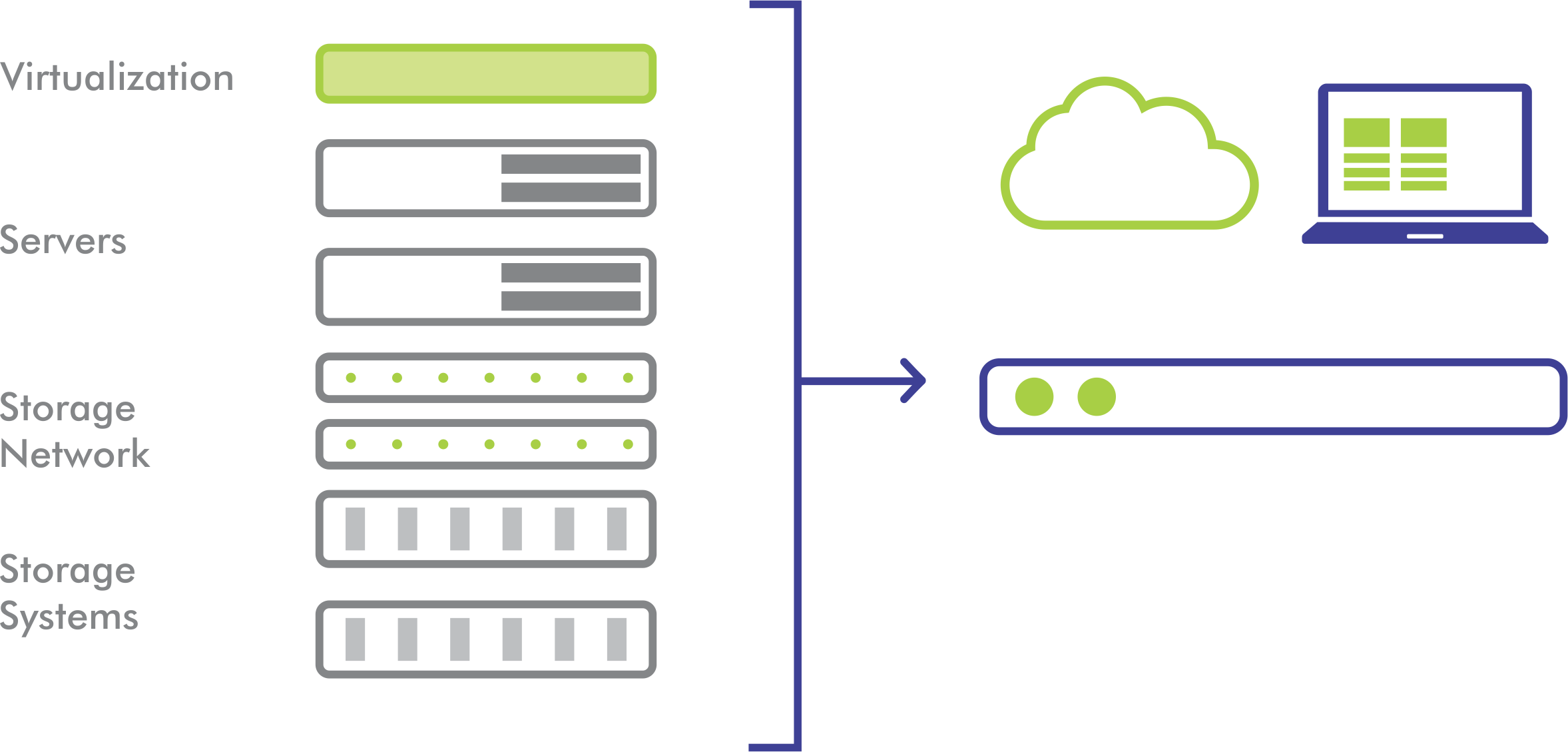 Con HCI se logra la convergencia de toda la pila del centro de datos, incluido el procesamiento, el almacenamiento, las redes de almacenamiento y la virtualización. La infraestructura tradicional, compleja y costosa, es sustituida por una plataforma que se ejecuta en servidores llave en mano, estándar del sector, y que permiten a las empresas comenzar a escalar de nodo en nodo. El software que se ejecuta en cada nodo del servidor distribuye todas las funciones operativas en el clúster para conseguir un rendimiento y una resistencia superiores.